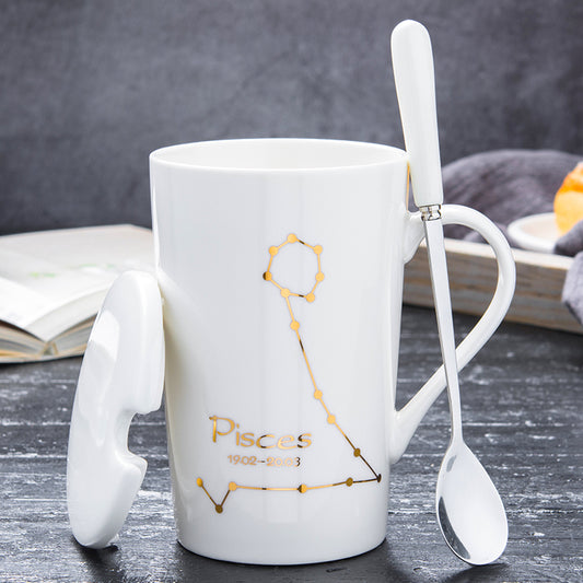 Luxury White Black 12 Constellations Gold Pattern Ceramic Coffee Mug With Lid Spoon And Gold Handle For Souvenir