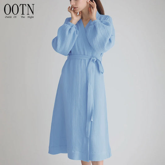 OOTN Cotton Robes Women Home Wear Spring Loungewear Puff Sleeves Bathrobe Female Nightwear Solid Color Sleepwear Women's Robe