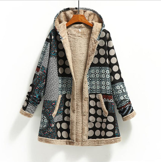 2023 Plus Size Vintage Button Fly Pockets Printed Thick Warm Woman Jacket Winter Coat