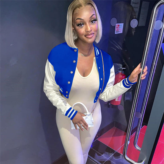 Winter Women Tops Crop Letterman Jacket Coat Button Down PU Leather Long Sleeve Baseball Coat for Girl