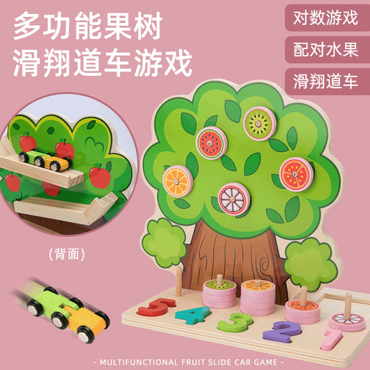 funny early education wooden multifunctional fruit tree slide car 2-5 years old children's digital matching toys pull back car