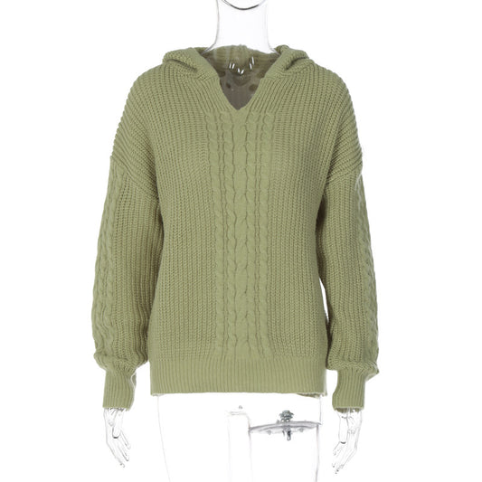 T3713479a New Fall Fashion Women's Knitted Tops Hooded Solid Color Long-sleeved Street Style Sweater Women Casual Hoodie