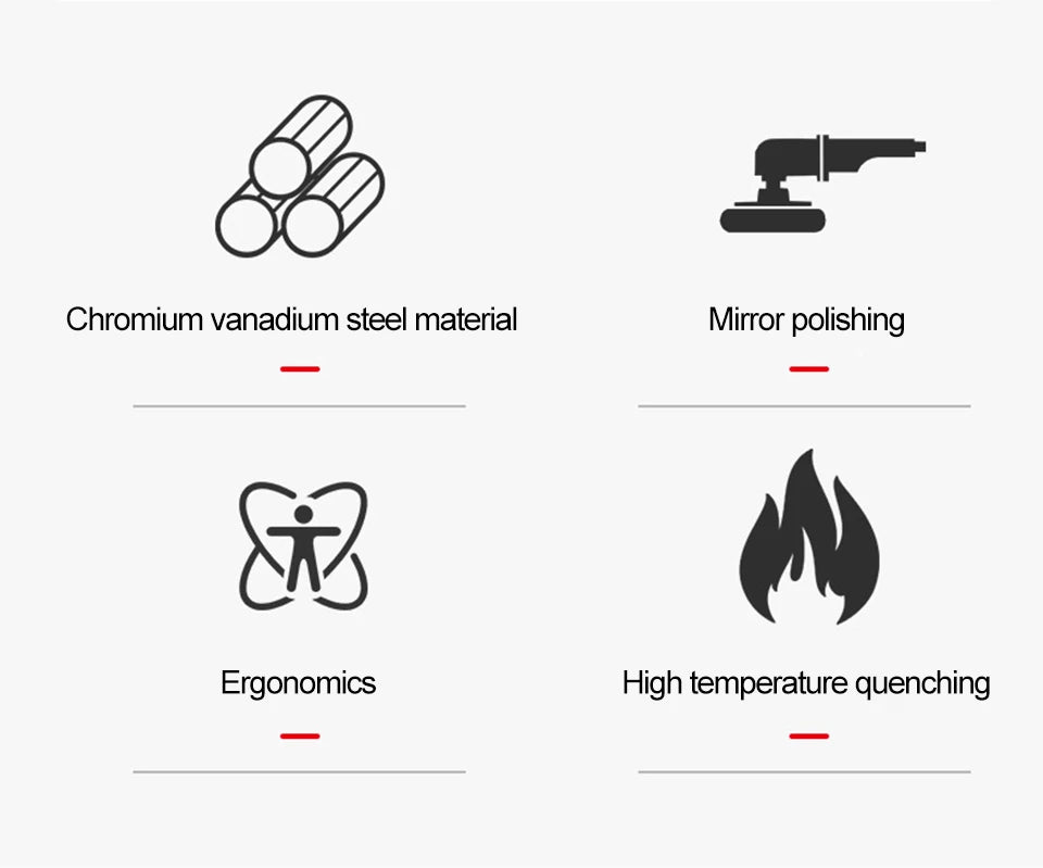 Our Advantages: Chromium vanadium steel material, Mirror polishing, Ergonomics, High-temperature quenching.