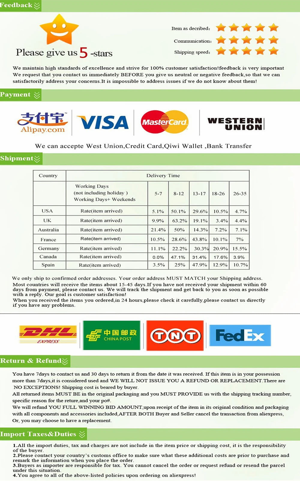 3. Your positive feedback is a great help to us. If you have any questions, please feel free to contact us and we will contact you within 24 hours.