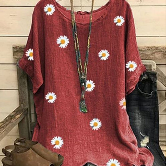 Large Size Women 5XL Loose Short Sleeve Crew Neck X-long Blouse New Arrivals Ladies Floral Printed Leisure Pullover Slit Shirts
