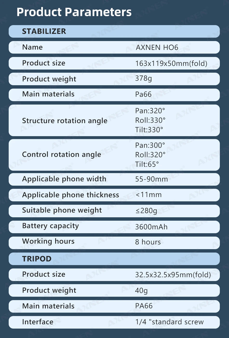Bundle 1:  AXNEN HQ6 Gimbal + USB Cable + User Manual + Mini Tripod + Color Box
