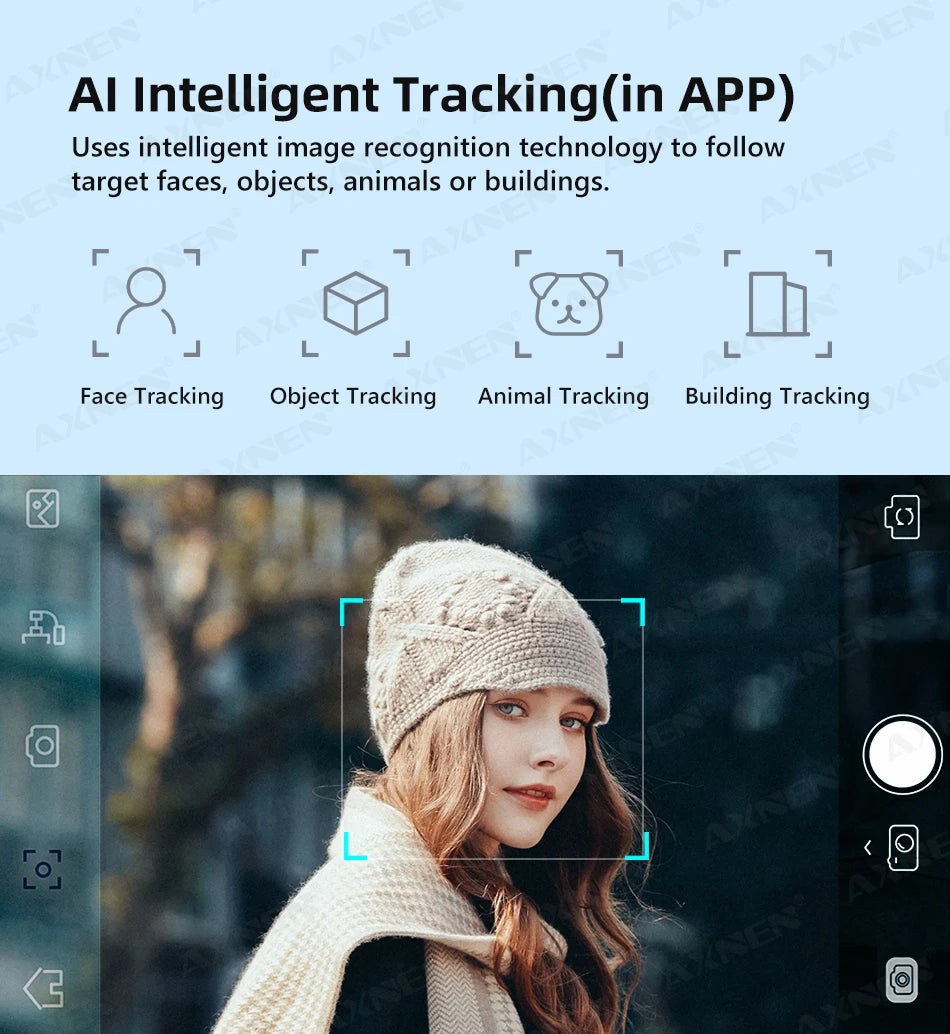 Uses intelligent image recognition technology to follow target faces, objects, animals or buildings.