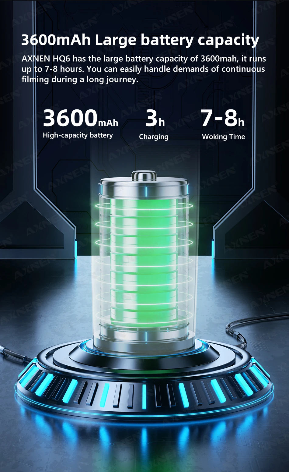 AXNEN HQ6 has the large battery capacity of 3600mah, it runs up to 7-8 hours. You can easily handle demands of continuous filming during a long journey.