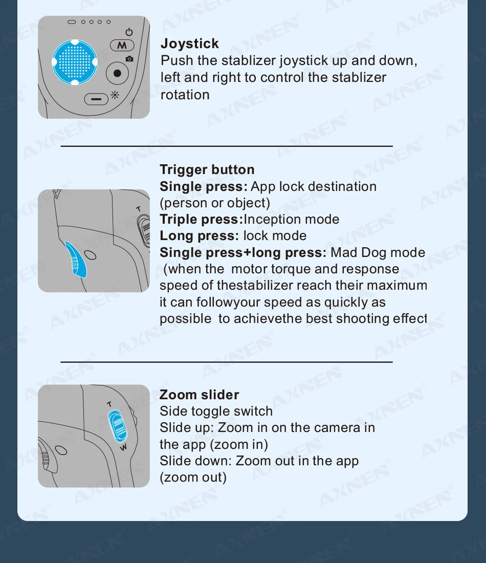 The Roll axis is locked, the Pan axis(left/right) and Tilt axis(up/down) will follow the movement of handle.