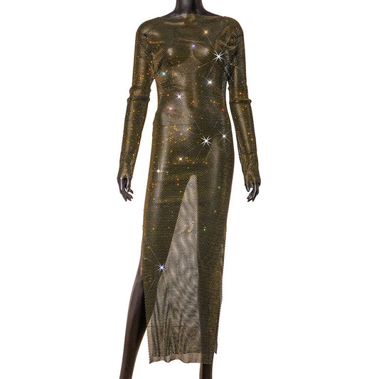 High Quality Luxury Mesh Rhinestone Dress Women Shiny Diamond Long Diamante Party Dress