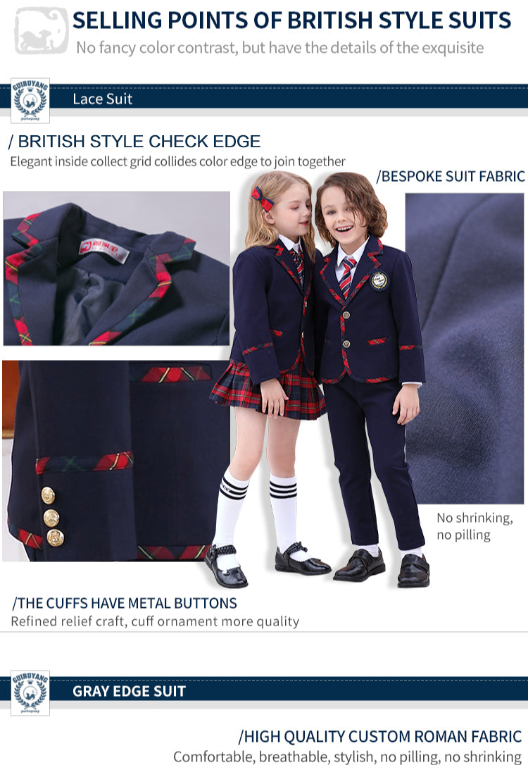 Brand: Guiruyang Fabric: top 68.7%Viscose 27.4%nylon 3.9%spandex sweater vest 100%cotton shirt above 96% cotton skirt 95%TR fabric (underpants 95%cotton 5%spandex) trousers 95% cotton and 2%spandex Style: fashion&preppy style&elegant gentleman&British style Design:V-neck;button cardigan; fashion color contrast ;patchwork ;edge-plated;side pockets;fit Feature: high quality TR fabric;no pilling and no fading no shrinking and anti-static; no formaldehyde; PH is neutral and no skin stimulation;Sustainable and environment friendly; Age group: 3-18 years Size: 100-185 cm Length: top long sleeves; girls dress knee length ; boys trousers Ankle length Sex: unisex Season: spring and autumn Service: Color,Size,LOGO , Tag ,badge ,others;ODM,OEM be acceptable R& D: Yes, we have our own independent R&D department;New fabric and styles will be developed every season