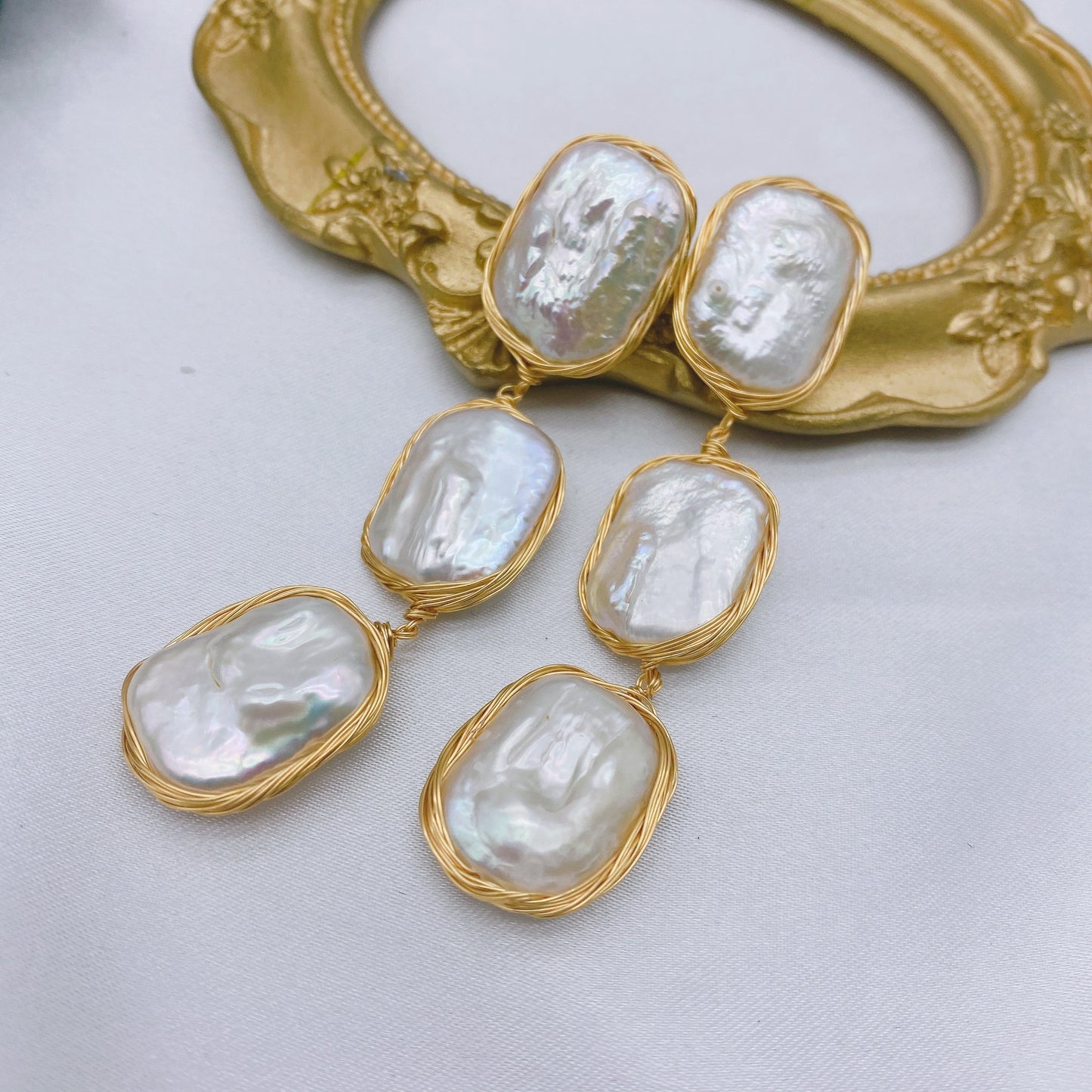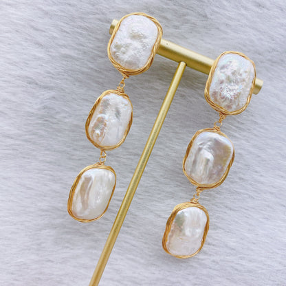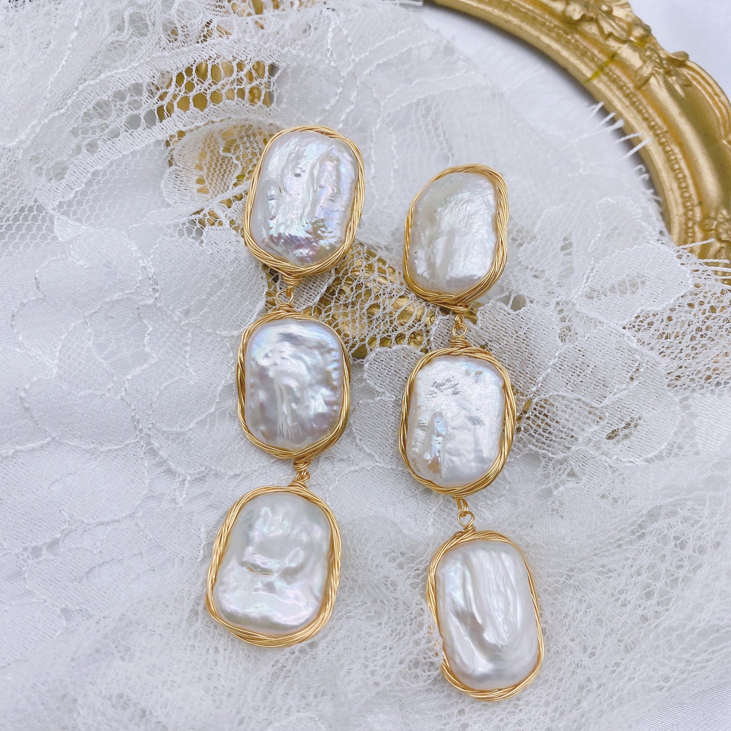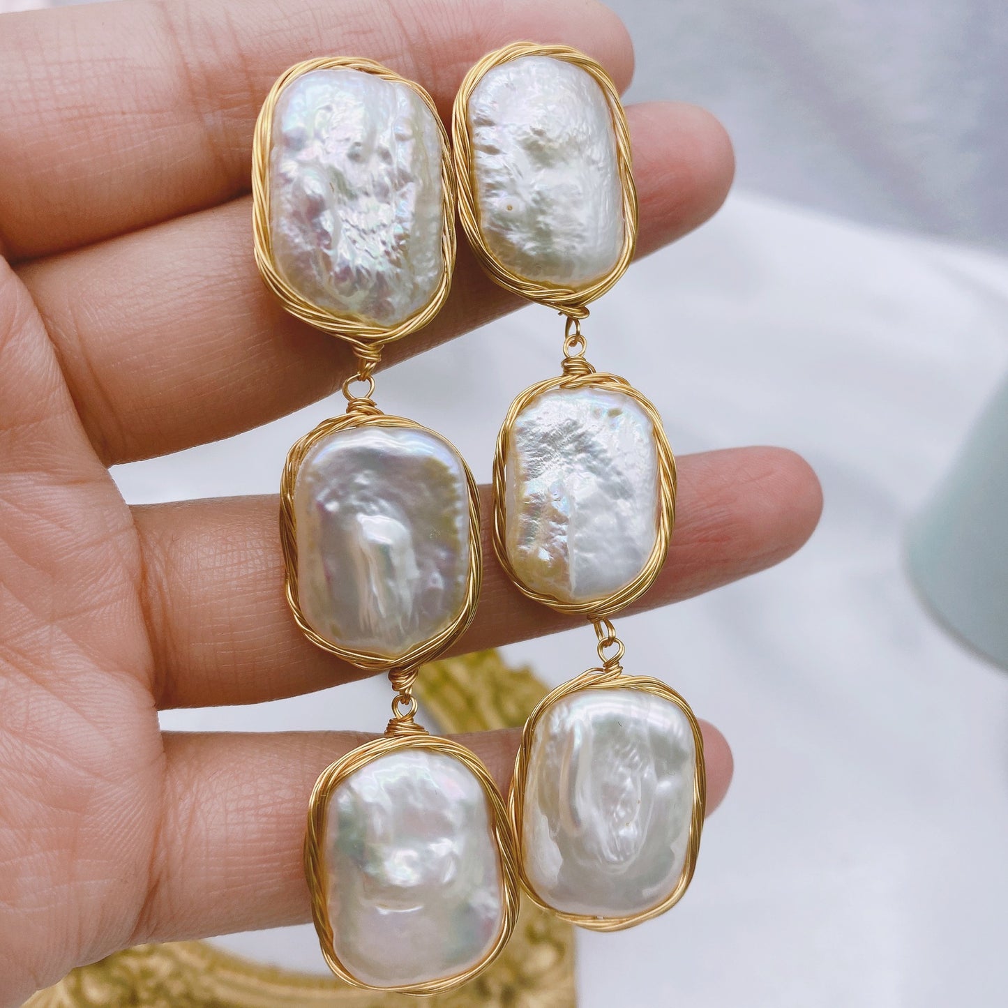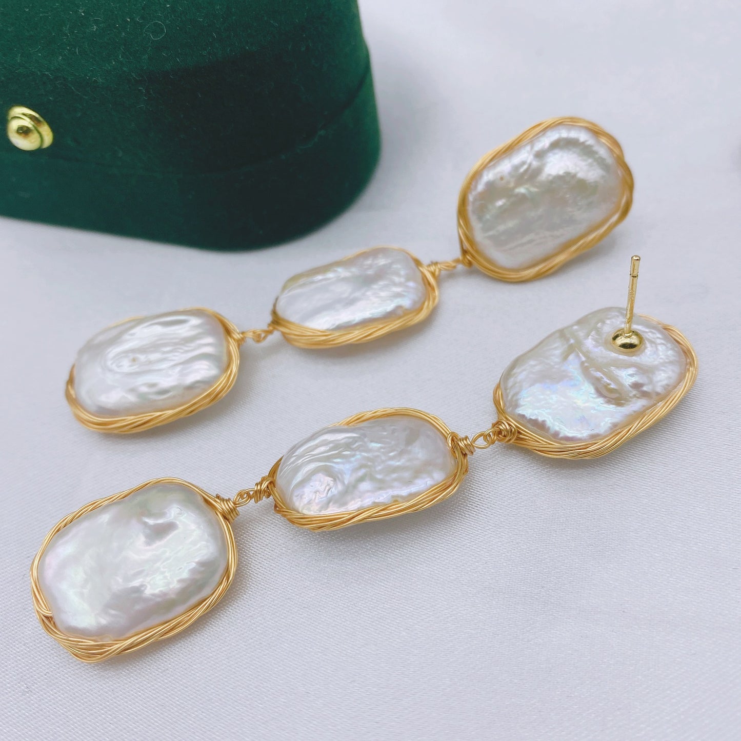 Aimgal fine jewelry S925 silver Hand Knit Natural baroque freshwater button pearl long drop earrings