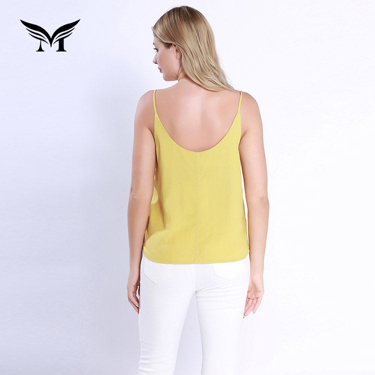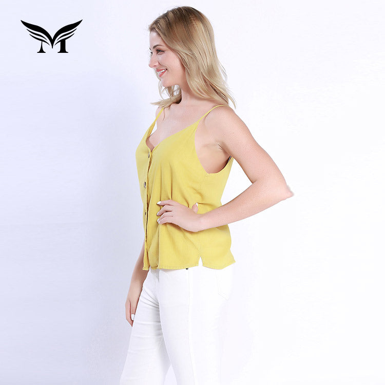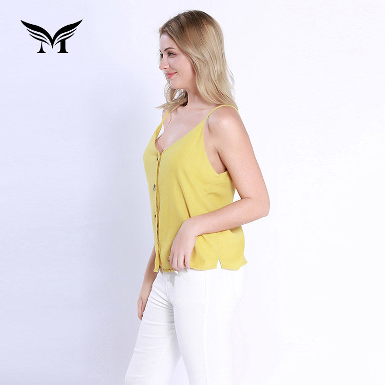 Good quality summer soft holiday spaghetti strap button-decorated casual blouse tops for women cotton
