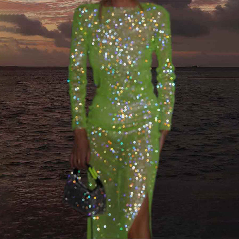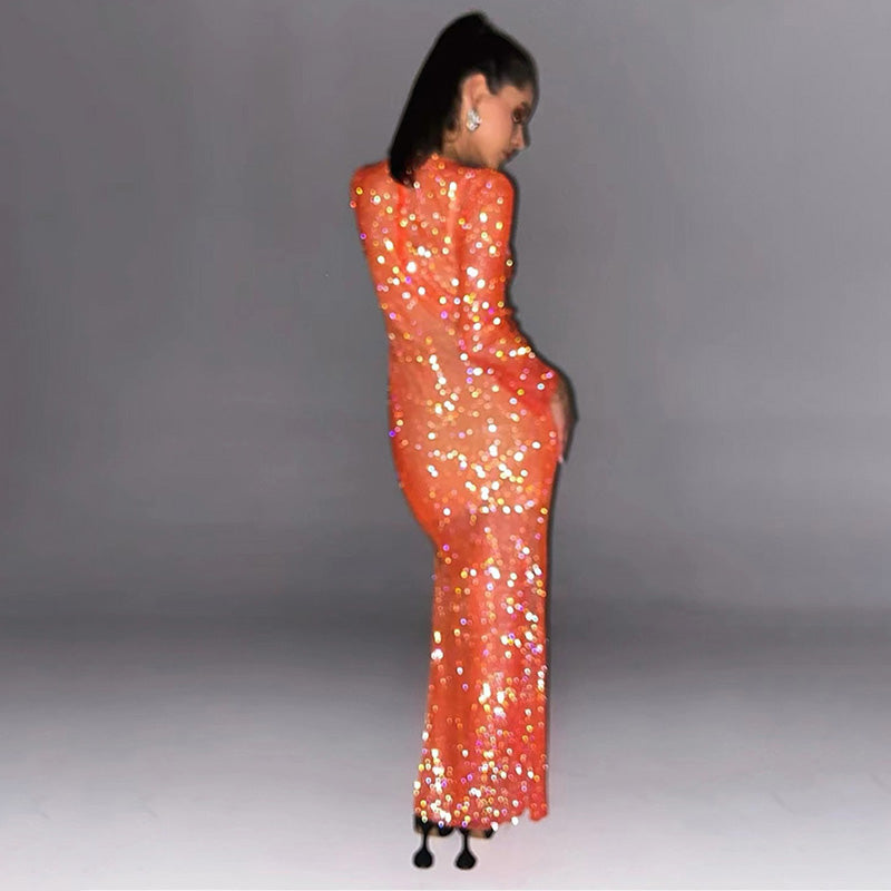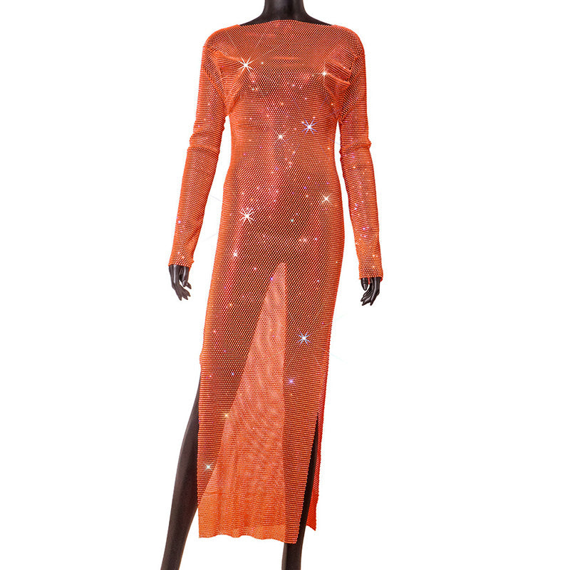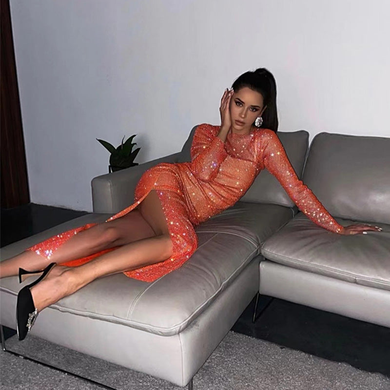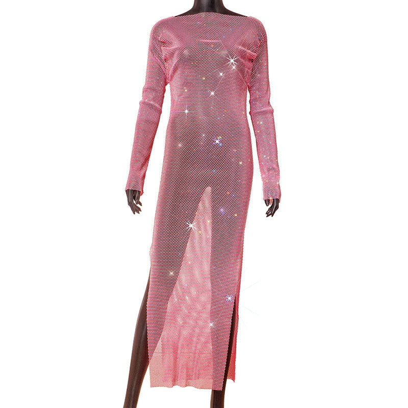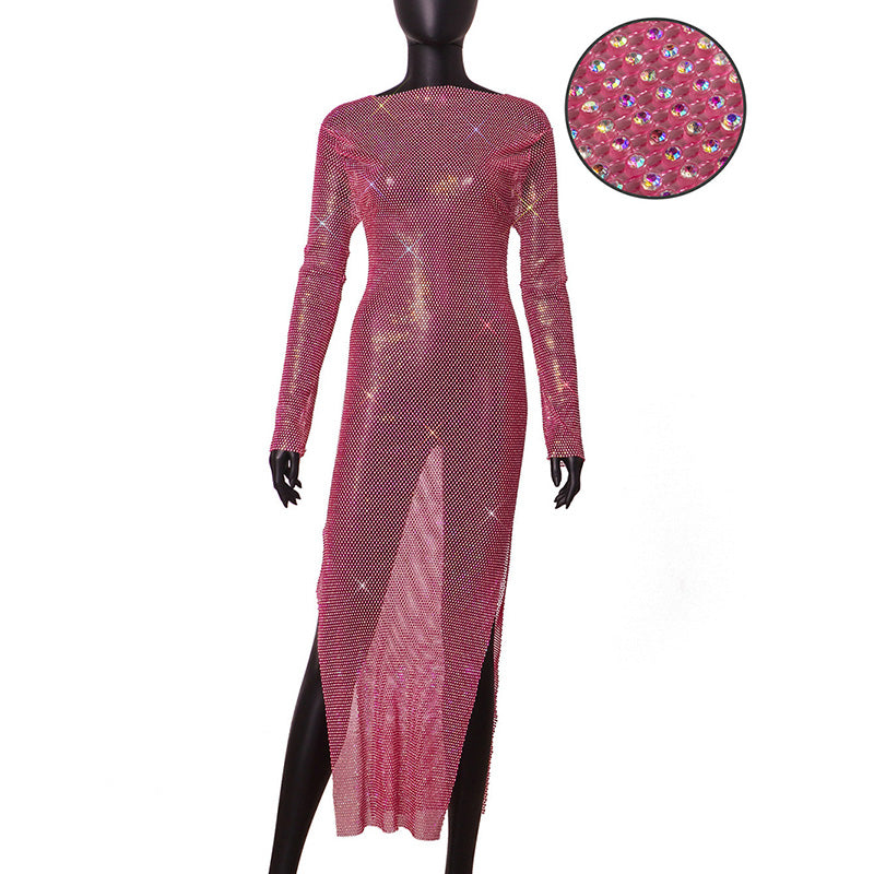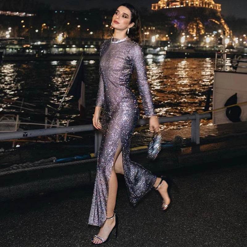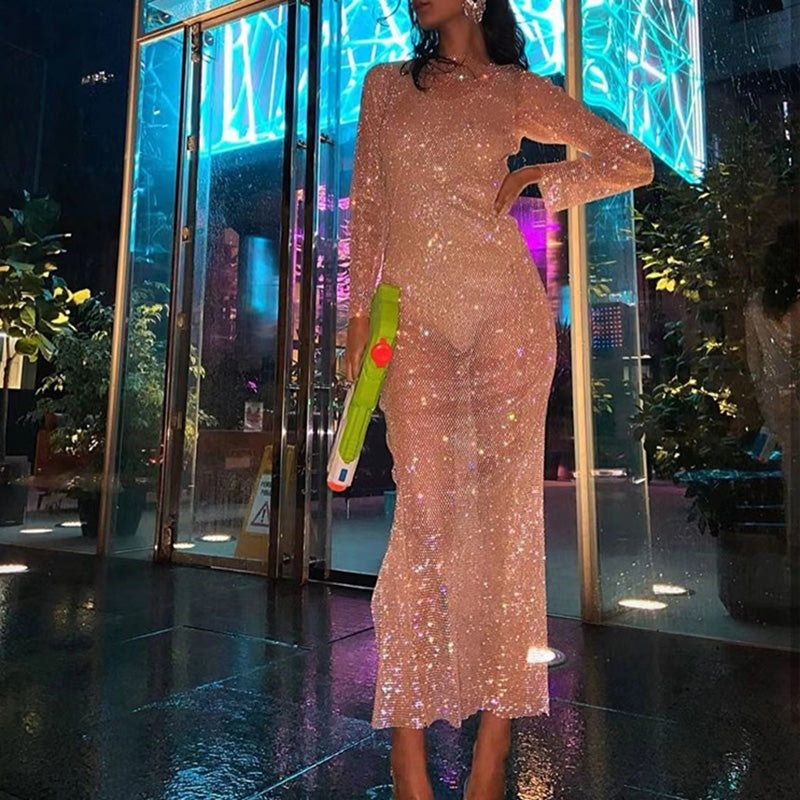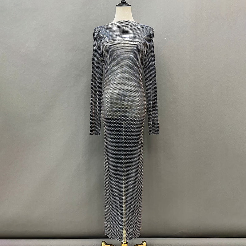High Quality Luxury Mesh Rhinestone Dress Women Shiny Diamond Long Diamante Party Dress