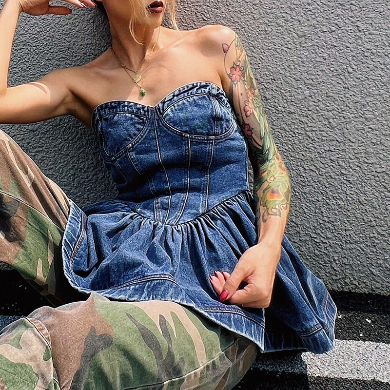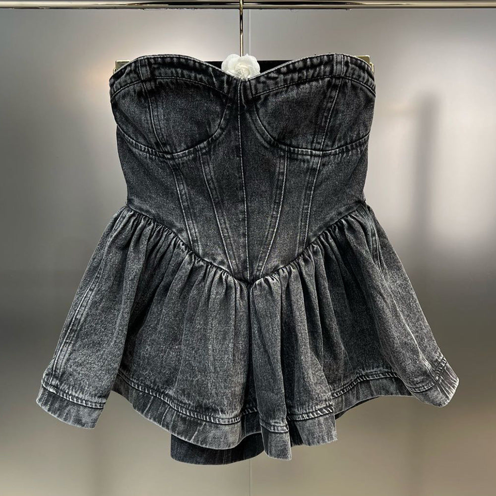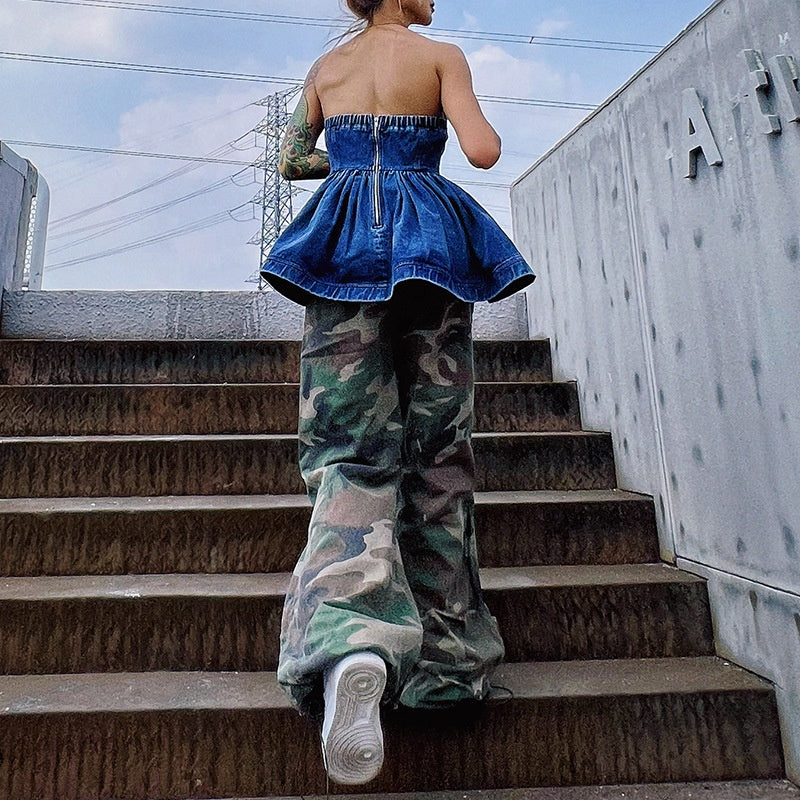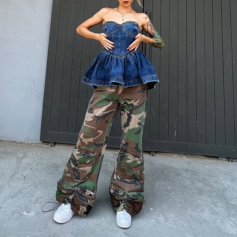 OUDINA RTS New Zippers Washed Ruffled Denim Top And Blouses Women Tops Fashionable