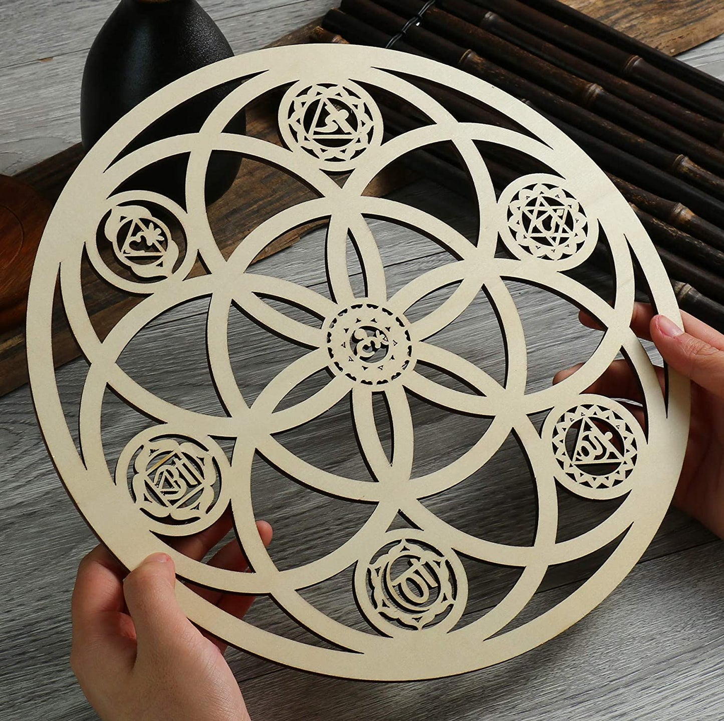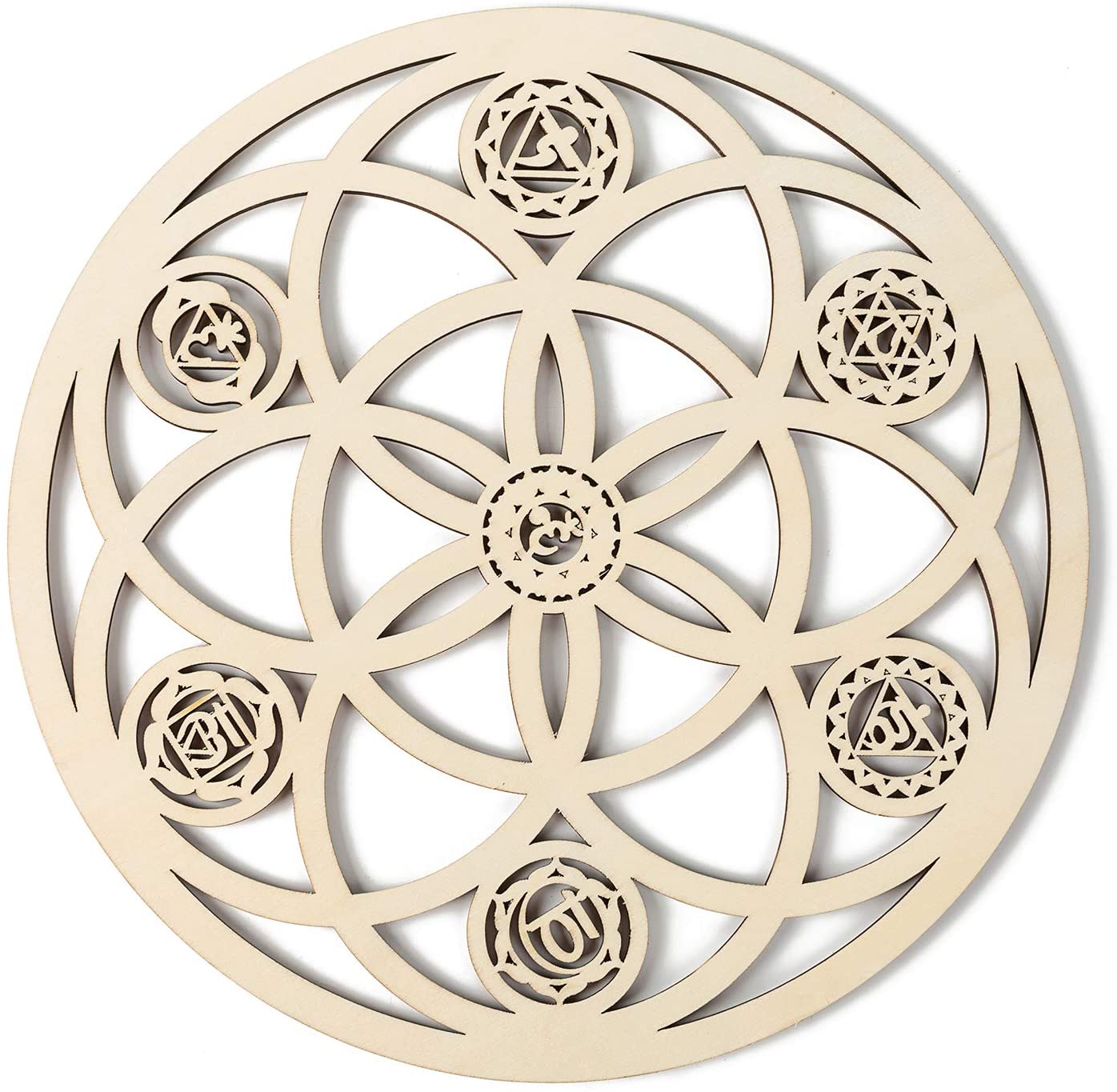 TaiLai 12 Inch Seed of Life 7 Chakra Wooden Wall Decor Wood Decor Sri Yantra Mandala Chakras Wheel of Life Grid Hanging Cutout