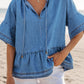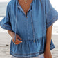 Tie Neck Ruffled Half Sleeve Denim Top